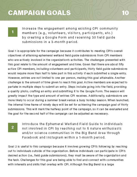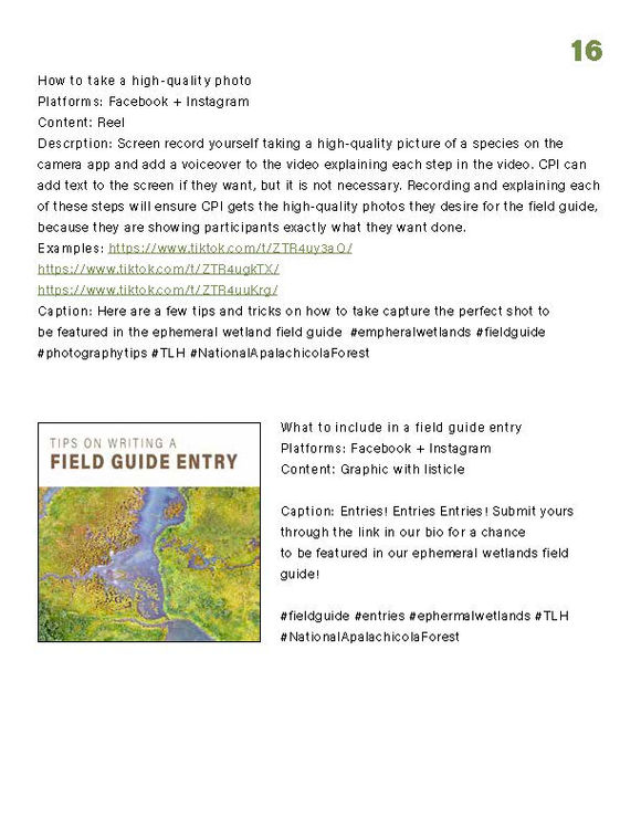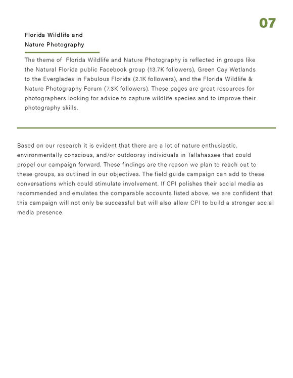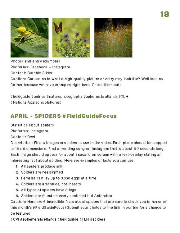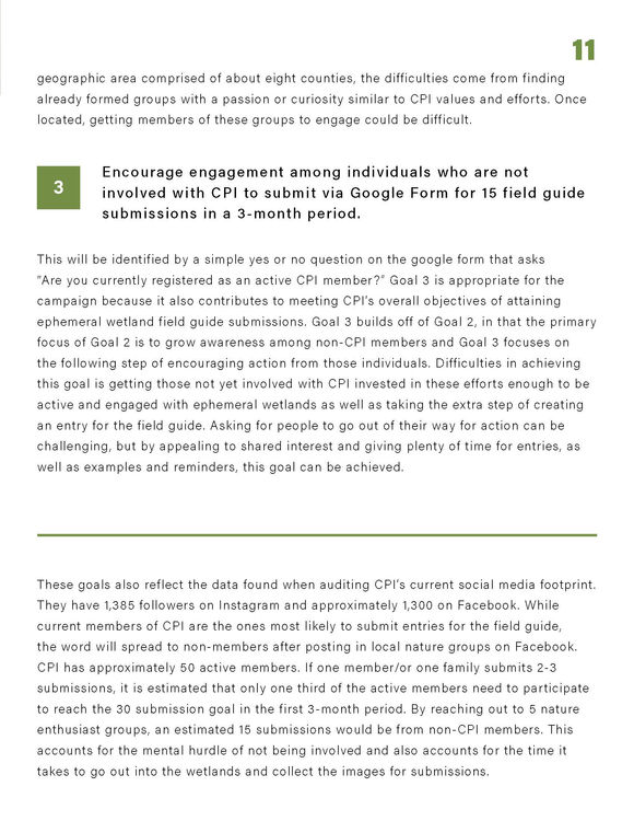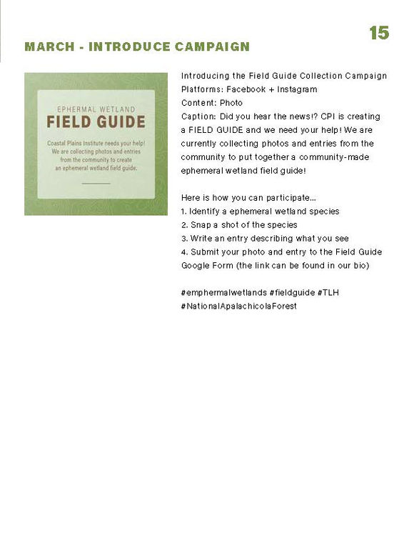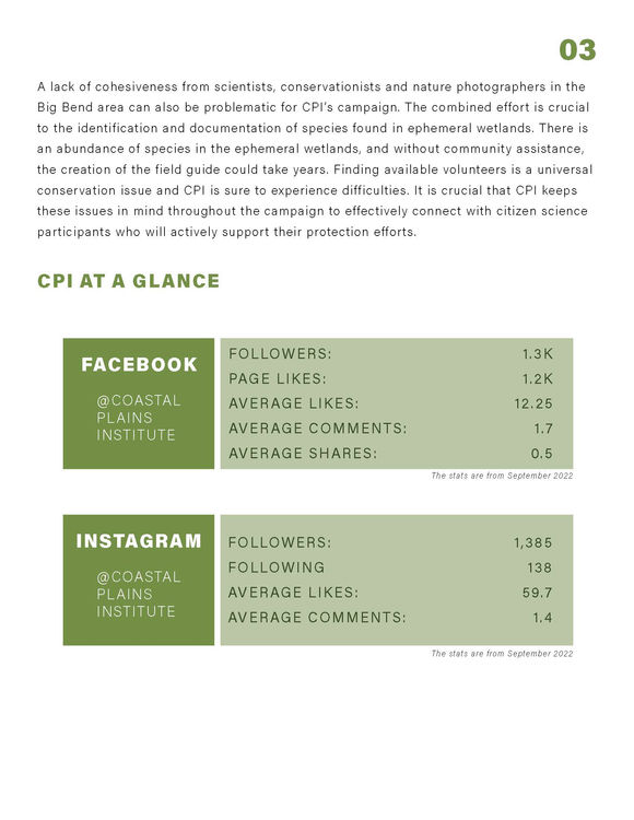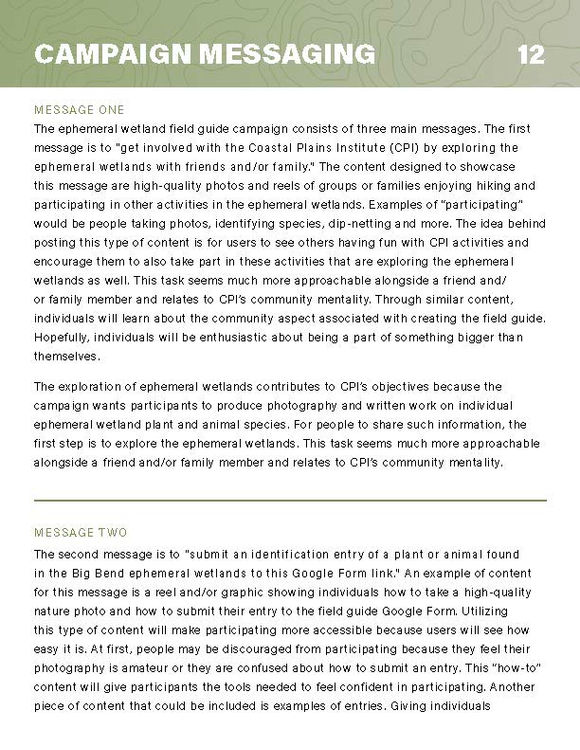 The following social media campaign focuses on creating an ephemeral wetland field guide for the Coastal Plains Institute (CPI). The campaign aims to increase engagement with existing followers and connect with the community through the client's primary platforms of Facebook and Instagram.